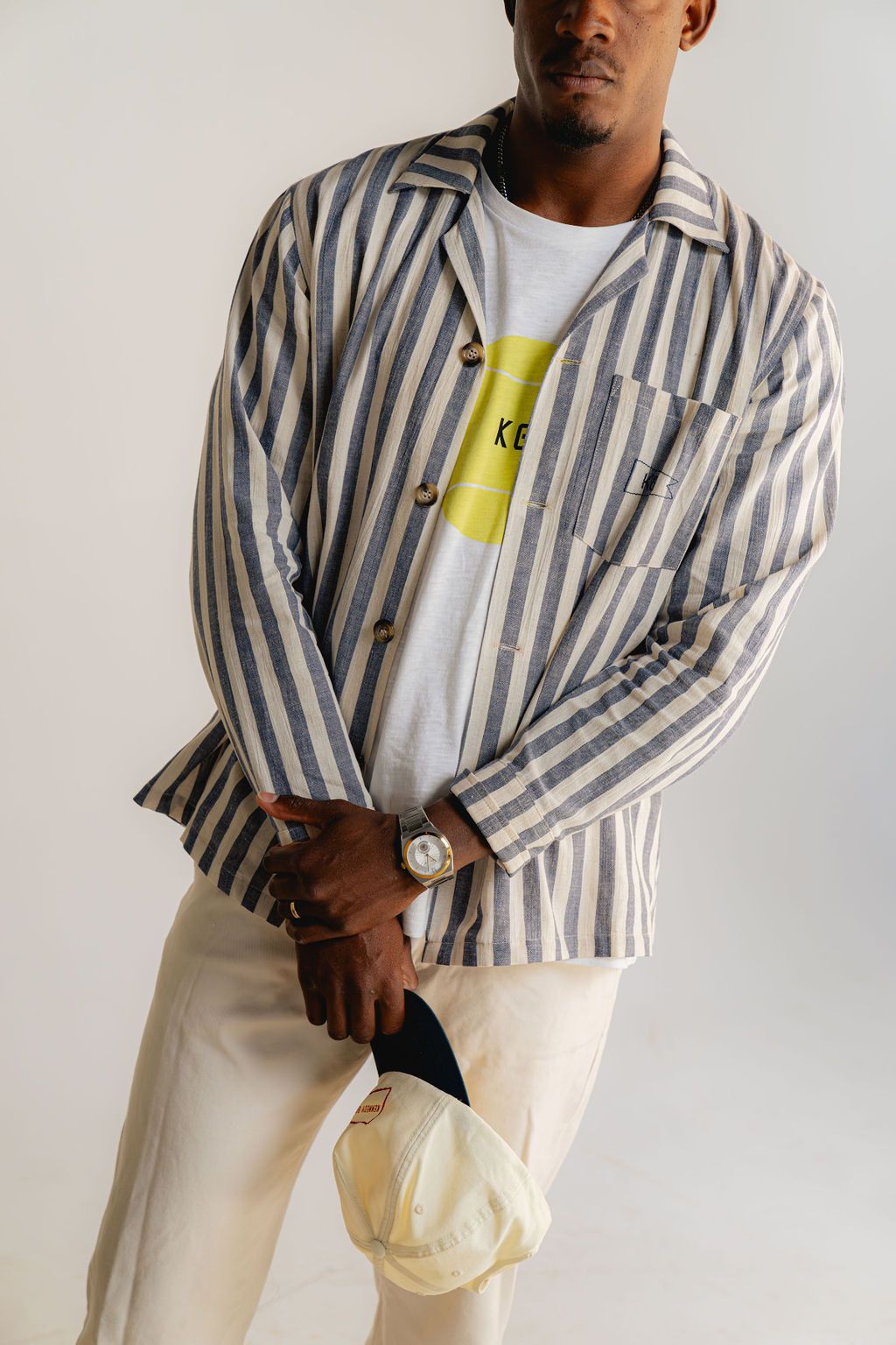 A classic nautical prep stripe linen cotton blend fabric. A laid-back essential with refined ease — the Kennedy Gray Linen-Cotton Stripe Camp Collar Shirt combines the airy texture of linen with the softness of cotton for effortless comfort and structure. Cut and sewn in The USA, finished with a hand sewn burgee flag on the chest pocket.